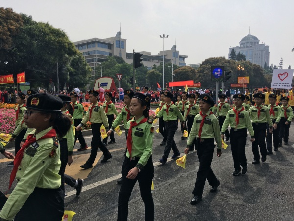 仙小少年軍校領袖團代表中山市少先隊工作委員會及中山市少先隊特色社團參加團市委游行方隊,他們身穿訓練服,精神抖擻、意氣風發,大步走在大道上,不時高喊習總書記對全國少先隊員的寄語“從小學習做人,從小學習立志,從小學習創造”,受到了圍觀群眾的熱烈喝彩。