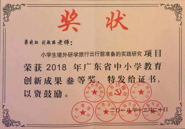 12月29日,天氣雖然寒冷,但擋不住科研的熱情。2018年度廣東省中小學教育創新成果獎頒獎大會在廣州市越秀區越秀賓館舉行。本屆創新獎評審全省共有679項成果參評,經過評審,共評出186項獲獎成果,一等獎3項、二等獎46項、三等獎137項。中山市石岐楊仙逸小學梁曉虹副校長和劉敏麗老師主持的《小學生境外研學旅行出行前準備的實踐研究》喜獲三等獎,梁曉虹副校長參加了此次頒獎大會。