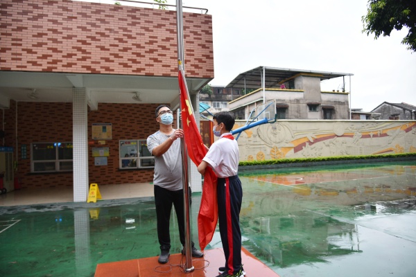 “復學第一課”,由陳惠良主任主持。首先是特別的升旗儀式。新學期第一面國旗,由六2班趙泳瑜爸爸趙權輝升起,趙權輝叔叔在疫情期間,一直堅持參加石岐區的志愿活動,他是一位熱心家長,學校哪里需要幫忙,哪里就有他的身影。伴隨著國歌緩緩響起,同學們莊嚴佇立,趙權輝的高大形象深深地印在了同學們的心中……