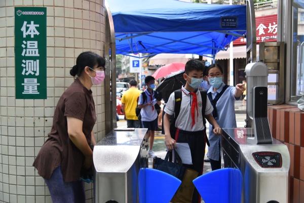 早上7:15分,學校行政、值日老師、家長護衛隊及蓮峰派出所警察叔叔們,早早地在校門口熱切地等候著返校的師生們。7:20分開始,學生有序地按學校錯峰安排陸續返校,盡管隔著口罩,也能感受到同學們按奈不住的喜悅之情。在老師的引導下,同學們以1米間距排隊,依次檢查復學碼和承諾書,通過體溫檢測等防疫步驟后才進入校園,把好入校安全第一關。四至六年級273名學生,全都順利返校。