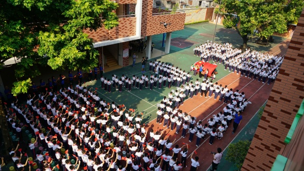 在同學(xué)們熱烈的掌聲中,陳惠良主任走上主席臺(tái),高舉右拳,帶領(lǐng)全校師生進(jìn)行呼號(hào) “祖國(guó)萬歲!祖國(guó)萬歲!”雄壯的聲音回蕩整個(gè)校園,響徹云霄。