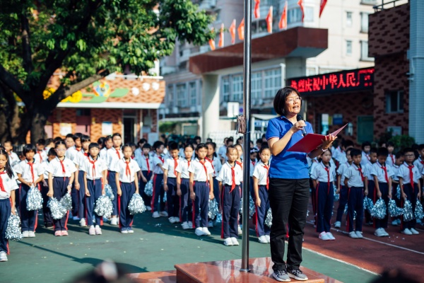 雄壯的愛國(guó)歌曲剛結(jié)束,低、中、高三個(gè)年段的愛國(guó)詩(shī)詞集體朗誦便一波接一波的涌來,太平小腳丫的赤子愛國(guó)之情在澎湃的朗誦聲中表達(dá)的淋漓盡致。緊接著就是莊嚴(yán)的升旗儀式,四位佩戴著鮮艷紅領(lǐng)巾的升旗手在莊嚴(yán)的國(guó)歌聲中將五星紅旗徐徐升起,全體教師行注目禮,少先隊(duì)員行隊(duì)禮,在金秋朝陽的照耀下,五星紅旗顯得更加的驕艷、溫暖與厚重。
