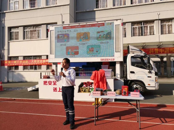“595安全大篷車”是以特殊改裝的貨車為載體,集舞臺、LED高清顯示屏、燈光音響、互動平臺、體驗?zāi)K、運輸、智能軟件等為一體的“移動式”科普館。廣東伍玖伍安全文化科技有限公司的宣講老師以“595安全大篷車”為載體,通過四維一體(講解+互動+實操+演示)的教學(xué)模式,現(xiàn)場開展消防、人防安全宣傳教育,讓同學(xué)們通過聆聽安全知識講座、安全知識互動問答、應(yīng)急用品使用方法演示、自救自護項目模擬體驗等方式,直觀、系統(tǒng)、全面的學(xué)習(xí)安全知識和防護技能。