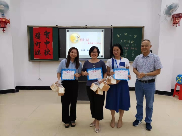 活動(dòng)開(kāi)始前,工會(huì)主席李慧冰副校長(zhǎng)發(fā)表了中秋致辭,向所有教職員工致以節(jié)日美好的祝福。隨后,陸麗瑜老師介紹了“猜燈謎”游戲規(guī)則。活動(dòng)以年級(jí)組為單位參加比賽。各組先抽簽選題,每套題共20條謎語(yǔ),謎語(yǔ)內(nèi)容涵蓋了日用品謎、成語(yǔ)謎、字謎、地名謎、文學(xué)謎、人物謎語(yǔ)以及腦筋急轉(zhuǎn)彎等題型。每組答題時(shí)間為5分鐘,每答對(duì)1題計(jì)1分,答錯(cuò)不扣分,按成績(jī)排序評(píng)選第一、二、三名。按照既定規(guī)則,員工們開(kāi)始踴躍答題,猜對(duì)了謎底的組員歡呼雀躍,現(xiàn)場(chǎng)氣氛熱烈,大家在溫馨愉悅的氛圍中感受到了中秋佳節(jié)的樂(lè)趣。經(jīng)過(guò)比拼,中年級(jí)組獲得第一名。梁炳根校長(zhǎng)為獲獎(jiǎng)的年級(jí)組頒發(fā)了獎(jiǎng)狀和獎(jiǎng)品,活動(dòng)在歡聲笑語(yǔ)中落下帷幕。