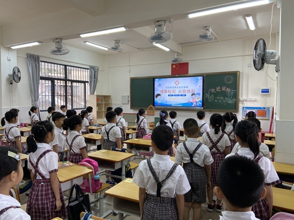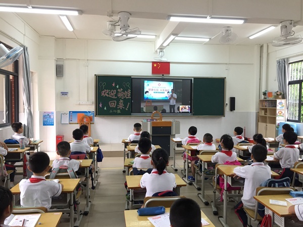 回歸班級,學生在正副班主任的歡迎聲中走進了久違的教室,見到了多日未見的同學們。第一節班隊會課,吳嬋娟主任組織學生在教室舉行升旗儀式,同學們整齊佩戴紅領巾,唱國歌,向五星紅旗行隊禮。學生個個高聲唱起國歌,眼神堅定,精神飽滿,用最好的狀態迎接“開學第一課”。緊接著,黃榮勝校長進行開學致辭,題為”健康校園,從我做起”。黃榮勝校長通過以下幾點進行介紹:一、介紹新型冠狀病毒肺炎的相關常識;二、教導孩子正確的洗手方法;三、為同學們提供校園防控方法并做了詳細說明。四、寄語新學期。最后,由各班班主任對線上學習進行小結,了解關心學生的學習生活,并帶領學生學習一日常規,保證學生能夠更快適應校園生活,更好投入到班級學習中來。
