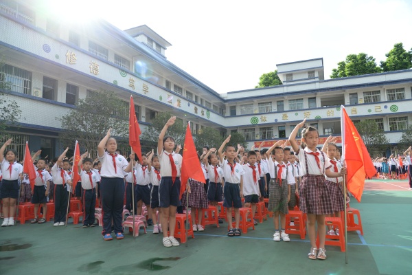 最后,在大隊輔導員周銳鵬老師的帶領下,全體隊員起立行隊禮,退隊旗!