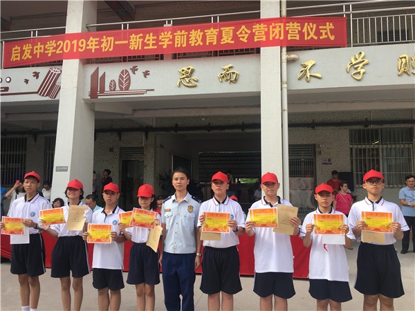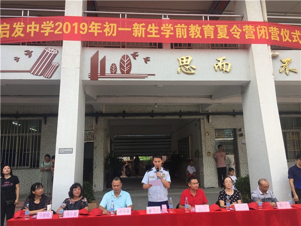 2019年8月29日下午,啟發中學初一新生學前教育夏令營閉營儀式正式拉開帷幕。參加本次閉營儀式的領導和嘉賓有:啟發中學校長謝永芳、城區消防中隊隊長蔡洋、啟發中學副校長祝玉珍、啟發中學副校長林容森、啟發中學教務處主任鄧小斐、啟發中學德育處副主任馬健媛;學校全體行政、全體教官、班主任和初一年級全體新生;部分新生家長也積極參加了本次閉營儀式。