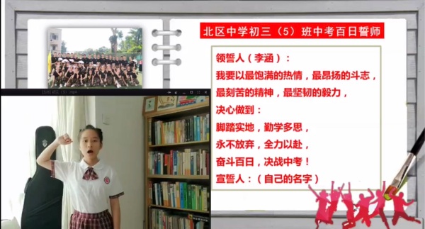 在家長代表發言后,各班領誓員帶領全班同學起誓。屏幕前的學生昂首挺胸,緊握右拳,高呼誓詞,家長們紛紛用手機留下珍貴的影像。各班的領誓人神情莊嚴凝重,聲音嘹亮激越,喊出了自己班級的誓詞,通過網絡感染著終端的每名同學和家長。初三級還發動了“掃二維碼,我要宣誓”活動。每位學生都鎖定自己的目標高中和說出自己的宣誓詞。最后,我校退休反聘的孫德菊老師連麥給學生寄語,她勉勵同學們珍惜當下,好好學習,同時表達了對北區中學深厚的感情。