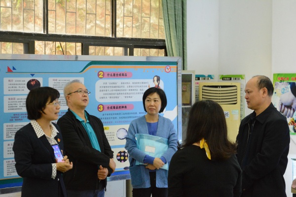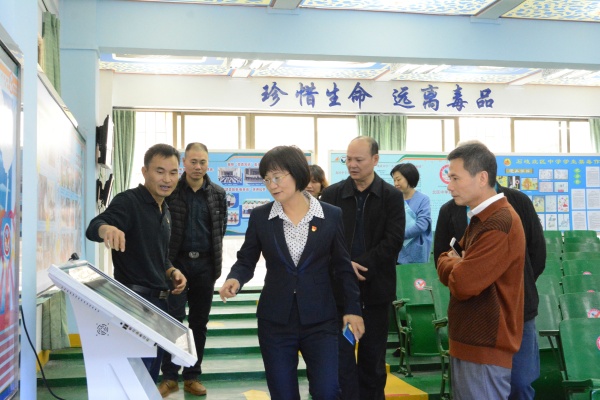 在趙翠顏校長的帶領(lǐng)下,考察團各位領(lǐng)導(dǎo)饒有興致地參觀了禁毒基地。在毒品標(biāo)本柜前,領(lǐng)導(dǎo)們駐足觀看,各式各樣的新型毒品模型,引起他們的深思和驚嘆;在禁毒展板前,禁毒感言、禁毒LOGO設(shè)計、禁毒漫畫、禁毒歌謠、禁毒誓詞和禁毒微劇本等,充分調(diào)動家長和師生參與禁毒活動的積極性,開啟“禁毒在體驗、禁毒在參與、禁毒在創(chuàng)作”的教育之路;在多媒體互動區(qū)域,禁毒網(wǎng)絡(luò)游戲闖關(guān)、吸毒后人臉變化系統(tǒng)吸引了不少來賓的注意,他們實地體驗,認為充滿趣味的互動讓毒品預(yù)防教育及普及青少年法治知識變得更加容易。
