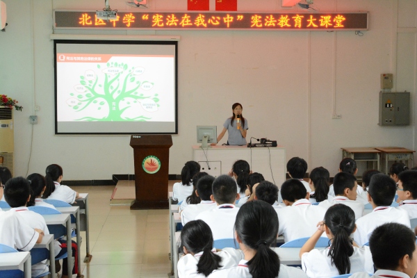 “憲法教育大課堂”是由省普法辦、省司法廳、省教育廳、團省委、省律協,根據中央和省關于開展憲法宣傳教育和貫徹實施的重要部署,圍繞“尊崇憲法、學習憲法、遵守憲法、維護憲法、運用憲法”,組織開展面向青少年學生的憲法學習宣傳教育活動。北區中學舉行“憲法在我心中”教育大講堂活動,讓學生學法、知法、懂法、守法,努力成為一名遵紀守法的好公民。
