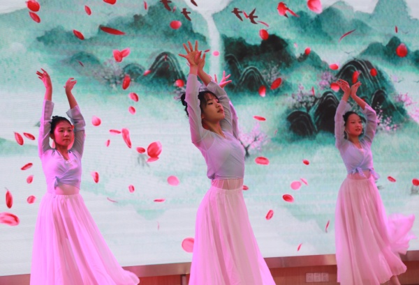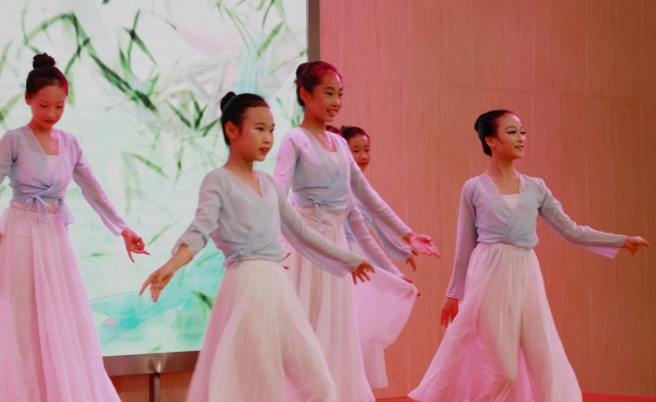 掛牌儀式結(jié)束后,體育路學(xué)校的孩子們載歌載舞,表達(dá)了對詩歌節(jié)的舉辦及傳習(xí)基地成功掛牌的喜悅之情!“知否,知否?應(yīng)是綠肥紅瘦?!币晃琛吨瘛纷尪嗌佻F(xiàn)場嘉賓進(jìn)入古典詩詞婉約、雋永的意境。臺下,同學(xué)們組成的百人方陣與臺上的表演者集體朗誦《我驕傲,我是中國人》,抒發(fā)炎黃子孫的文化自信與豪情壯志!“予獨愛蓮之出淤泥而不染,濯清漣而不妖......”雷經(jīng)石老師以楊仙逸將軍家鄉(xiāng)話傾情朗誦《愛蓮說》,讓人倍感親切!詩歌余音繞梁而未盡,緊接著學(xué)校民樂隊的同學(xué)為大家?guī)硪磺『献唷稓g沁》,歡快活潑的旋律沁人心扉,仿佛回到嬉戲玩樂的童年,又像置身在鳥兒自由飛翔的叢林里。雨墨丹青社團的同學(xué)向大家展示了他們的國畫牡丹和書法作品。