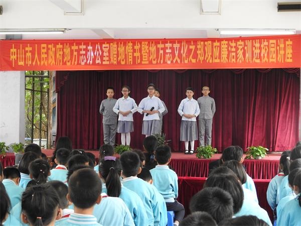 2018年11月28日上午,中山市人民政府地方志辦公室在博愛小學舉行中山地方志辦公室地情書贈送儀式暨地方志文化之鄭觀應廉潔家訓進學校普及講座,中山市地方志辦,市鄭觀應文化學會長吳冉彬、副會長匡和平,副秘書長羅淑怡等領導出席此活動。