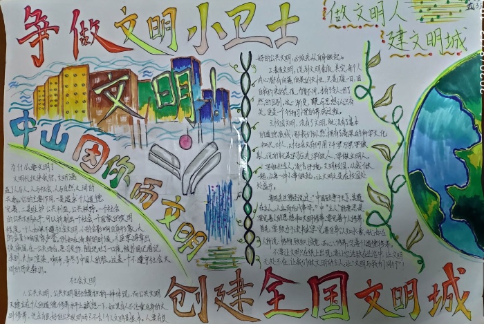為深入踐行社會主義核心價值觀,為了讓創文宣傳活動更深入地開展,切實貫徹執行中山市創建全國文明城市文件精神,開發區第三小學少先隊組織開展創文主題繪畫活動。以比賽為契機,以孩子帶動家人,齊齊參與到創文活動中來。隊員們利用暑假在家休息的時間,圍繞活動主題,發揮想象,廣泛搜集資料,認真設計版面,創造出了一幅幅內容豐富、形式多樣的繪畫和手抄報作品。隊員們以豐富的想象力詮釋了自己對“創文”的理解,用手中的彩筆盡情描畫了自己對創建文明城市的熱情。
