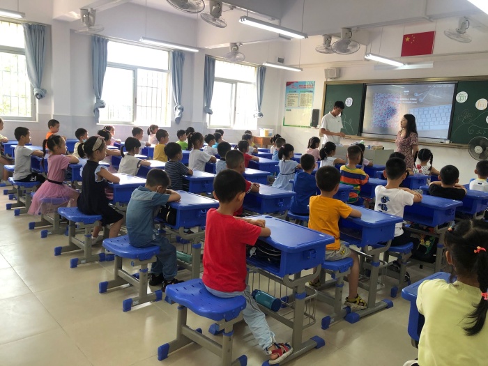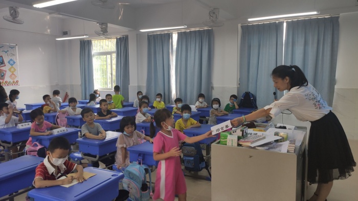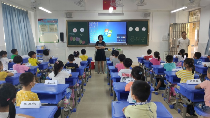 早上八點不到,教室里,班主任早已準(zhǔn)備就緒。孩子們根據(jù)名牌找到自己的座位,正式開始一年級的學(xué)習(xí)生活。很快,教室里傳出了老師溫柔的教導(dǎo),和稚嫩的回應(yīng),孩子們在老師的講解下,認(rèn)真的學(xué)習(xí)小學(xué)的各項常規(guī)。孩子們在班主任以及級組長的幫助下,正一筆一劃地學(xué)寫數(shù)字和自己的名字。