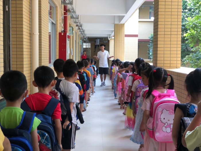 班主任教育完,就到體育老師登場了。孩子們在體育老師的指揮下,迅速地按高矮個子排好了隊,安靜整齊來到操場集中,學(xué)習(xí)隊列內(nèi)容。一整天的新生培訓(xùn)在全校各級領(lǐng)導(dǎo),各班主任,體育老師得帶領(lǐng)下進行地有條不紊。孩子們在短短一天的時間內(nèi)熟悉了校園、進行了列隊訓(xùn)練、學(xué)習(xí)了疫情情況下的入校方式、廣播體操排隊、上洗手間、課間游戲等學(xué)習(xí)生活必須的技能,臉上都洋溢著對學(xué)校生活的憧憬與好奇。