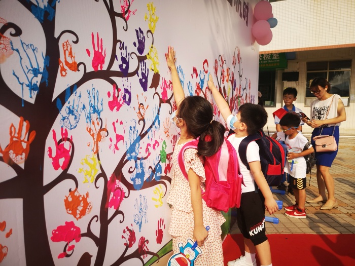 早上,滿懷興奮與期待的新生和家長們用熱情喚醒了校園,五小的老師們也早早地站在校門口迎接小朋友們。孩子和家長們走在紅地毯上穿過樂學(xué)門,在“夢想樹”的樹枝上留下了自己的小手掌印,一個個五彩斑斕的小手掌印仿佛滿樹碩果掛滿枝頭。