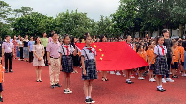 首先,全體師生舉行莊嚴的升旗儀式。現場,全體肅立,伴隨著雄壯的國歌聲,五星紅旗冉冉升起。學校禮儀隊的少先隊員們為教師代表獻花。來自一至六年級級組、藝術科組、體育科組、綜合科組、行政組共10名教師代表接受獻花。來自四(2)班的優秀少先隊員代表陳泳霖同學致辭,表達對全體教師感激之情。最后,全體同學齊唱《聽我說謝謝你》。當2800余名孩子們用稚嫩的聲音齊聲高唱“你是我的天使,一路指引我,無論歲月變幻,愛你唱成歌。聽我說謝謝你,因為有你,溫暖了四季……”溫情的歌聲傳達著孩子們對老師諄諄教誨的無限感激。在這無限感動的一刻,眼眶濕潤著的老師們感到了為人師者的莊重與神圣,欣慰與幸福。