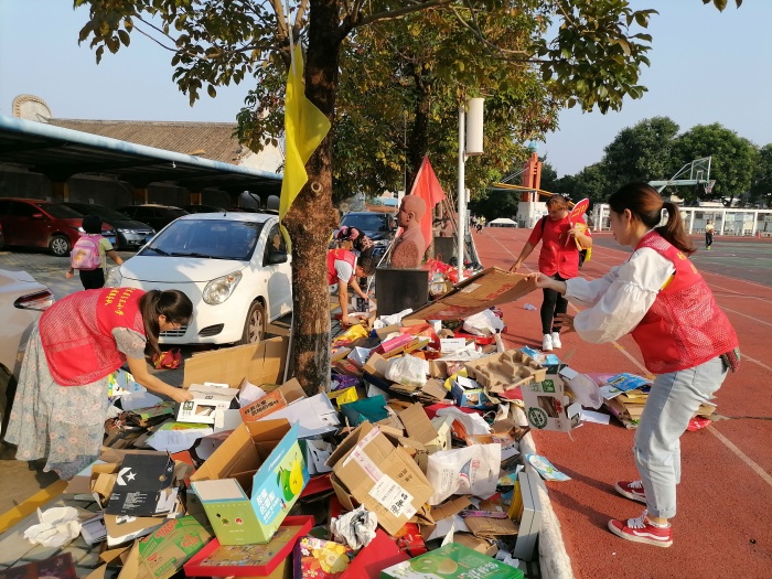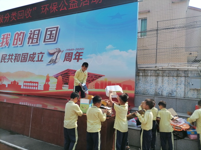 活動前,學校就利用升旗儀式、少先隊活動課向學生介紹回收垃圾的意義,樹立學生的環保意識,并科普生活中可回收垃圾的相關知識,讓學生有意識的尋找可回收垃圾。還通過班級、家委Q群向家長發出活動倡議,幫助學生在家開展可回收垃圾的收集活動。本次活動除了收集常規的可回收垃圾外,還結合“中秋節”開展了月餅盒的收集,得到了學生和家長的大力支持和響應。