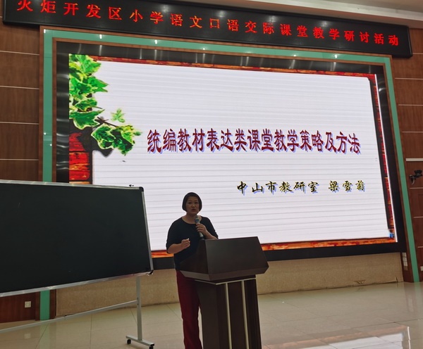 接著,梁雪菊老師給與會老師們作了《統編教材表達類課堂教學策略與方法》的專題講座。梁老師從解讀課標入手,對應地解讀教材,最后直擊課堂,讓老師們明白:口語交際的教學一定要圍繞交際的雙方進行教學,讓交際的雙方都學會傾聽、表達、應對,這樣,口語交際課才能真正落到實處。