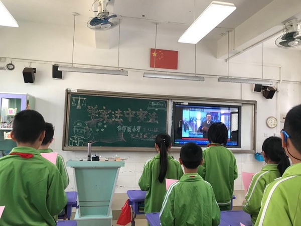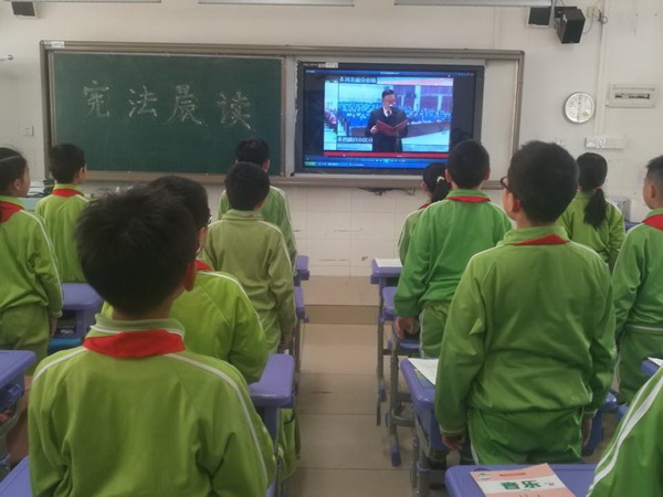 憲法日當天早上,學校組織各班級開展了“讀憲法、學憲法、懂憲法、爭做守法小公民”主題學習活動。全體學生在老師的帶領下觀看教育部在北京舉辦的“憲法晨讀”活動,并學習了《中華人民共和國憲法》第一條、第二條、第五條……第四十六條、第五十四條等重要內(nèi)容。在各班主任老師的領誦下,伴隨著朗朗的誦讀聲,師生們深深地感受到憲法作為國家根本大法的神圣不可侵犯性。