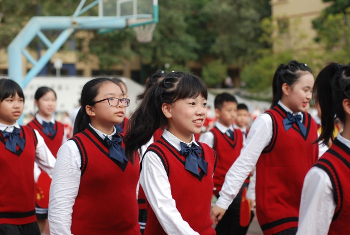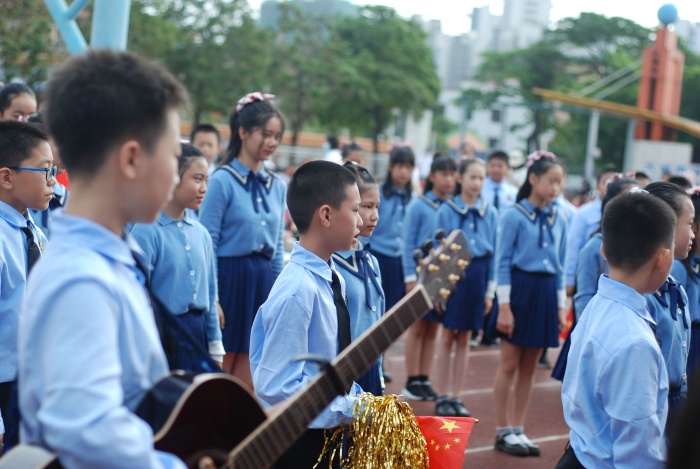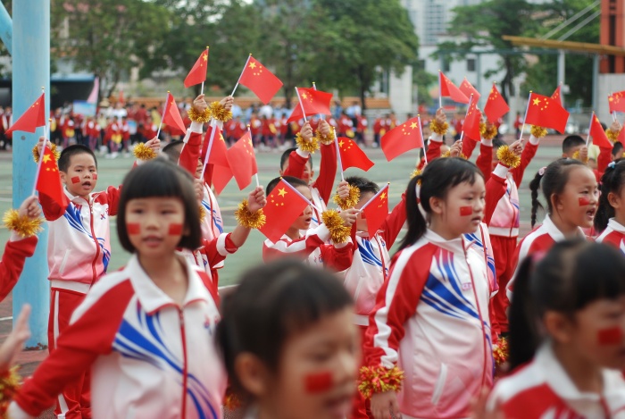 入場式結束,雄壯的國歌聲響起,莊嚴的五星紅旗和校旗飄揚在運動場上空。