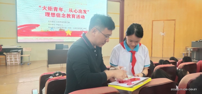 2020年是中國少年先鋒隊建隊71周年,為了進一步激發新時代少先隊員、共青團員的愛國熱情,樹立遠大理想,培養優良品德,積極踐行社會主義核心價值觀,11月9日下午,由開發區團工委主辦、同益社工承辦的“火炬青年,從心出發”理想信念主題教育活動在火炬二中學術報告廳順利開展。