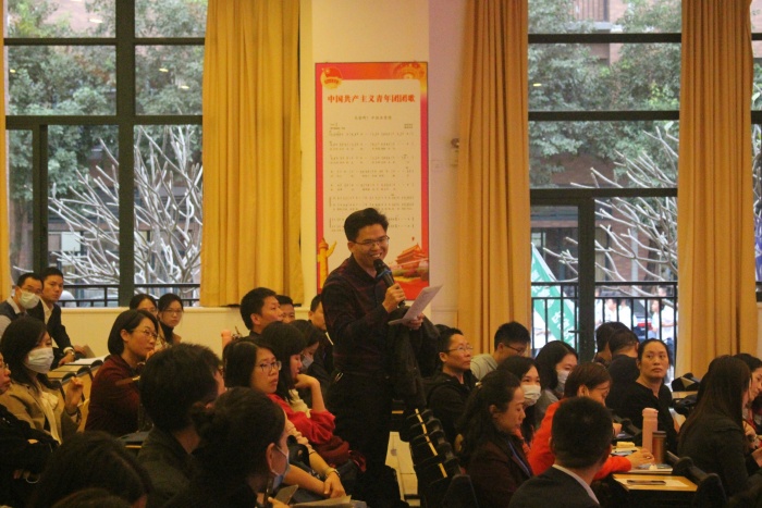 觀摩課結束,參會人員集中研討交流,汪和生副院長主持建議來自不同區的老師能自由點評一下。來自東莞、中山其他試點校的老師在肯定紀雅取得優秀成果基礎上提出幾點疑惑,如小組合作學習的任務安排與效果評價,小組文化建設、班級文化建設中的德育與教學目標怎么劃分,英語課如何用信息技術體現學生的思維。這些疑惑,王校長自信從容,結合紀雅的操作經驗、現實做法,輕松地一一作了回答。