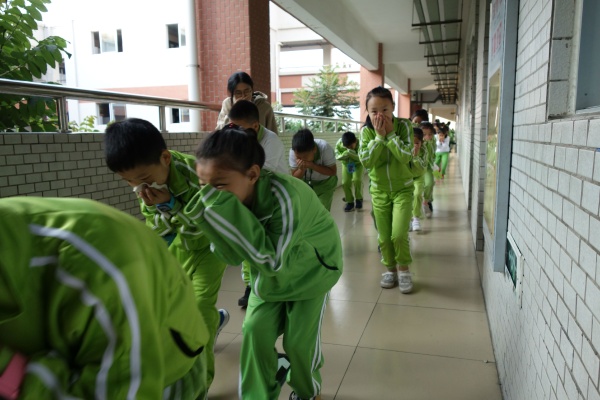 演練時,現場總指揮宣布“老師們,同學們,安全逃生演練現在開始!”同時警報鳴響,各班級的學生紛紛從教室涌出,用衣物捂著口鼻,在各樓層疏導員的指揮下有秩序地逃離,彎腰小跑逃生到學校的操場上。學生到達后,各班主任立即清點本班學生人數,并把人數情況迅速向有關負責人匯報。最后,全校師生安全到達指定地點。在逃生過程中,同學們按照規定的路線練習逃生,未見喧嘩、吵鬧、擁擠現象。