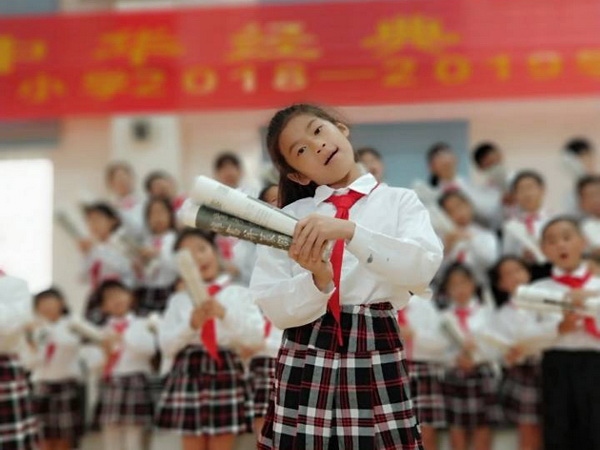 四年級的《千字文》和五年級《論語》同樣精彩。有誦讀,有吟唱,有配樂表演,有動作演繹,還有書法表演穿插其中。特別值得一提的是四6班的孩子們,全文倒背如流,看得其他班的同學不由得豎起了大拇指。同學們在誦讀表演和觀看欣賞中,感悟了中華文化的源遠流長,體會了華夏經典的博大精深,感悟著語言文字的魅力,拓展了古今視野,提高了自身的修養。
