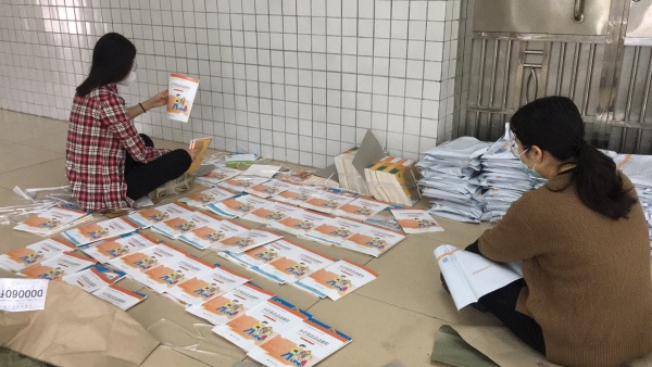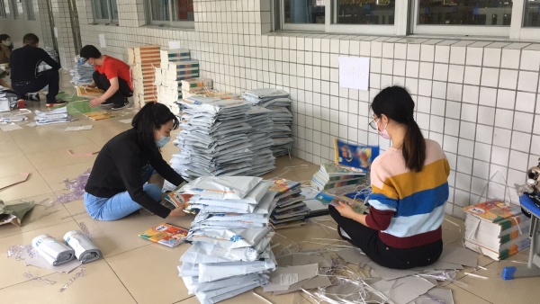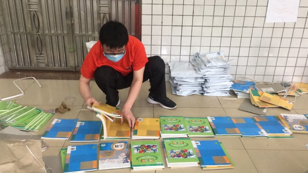 在這特殊時期,為了讓孩子們有書可讀,又避免聚集的風險。該校后勤部門確定使用“零接觸”的郵寄方式把新學期的課本送到每一位學生手中。迅速組織班主任做好每一位學生的信息登記、統計,反復核對確保信息無誤。信息收集完畢后,幾位教師主動承擔到校協助郵政人員按年級、班級、人員對書本進行打包處理的任務,以最快的速度確保學生的學習用書的到位。
