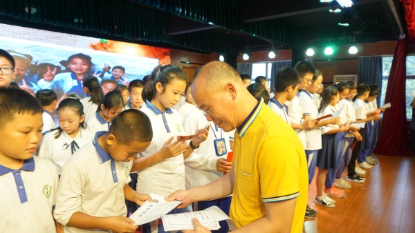 在典禮上,學生代表發(fā)表了感言,表達了他們的心聲。少先隊員代表向學校領導及六年級所有任課老師獻花、敬禮,教師代表陳一蕾和副校長沙泉源對即將離開母校的孩子們深情寄語,表達了對孩子們的美好祝愿。在《世界因你而美麗》的音樂伴奏中,沙校長為六年級每一位同學頒發(fā)畢業(yè)證書,祝賀全體六年級學生順利完成了小學的學習任務,開始新的人生征程。