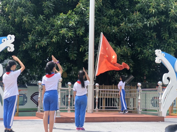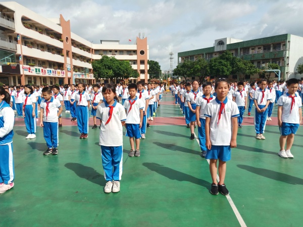 雄壯的國歌拉開了開學典禮的序幕。典禮伊始,水潤大隊的兩位隊干,為一年級248位新同學送上了衷心的祝福,為新加入五小大家庭的10位新教師送上誠摯的感謝。接著,胡校長帶領萬小兵主任、葉斐老師和何碧媚老師為新學期作國旗下講話。他們以朗誦的形式,用滿腔摯愛和真誠表達了對祖國的熱愛,祝福祖國母親更加繁榮富強,激勵全校師生要踏實奮進,點燃了學生愛黨、愛國的情懷。最后,由新教師陳煜老師和新生代表吳芯瑤同學發言,他們向全體師生表達了作為五小新成員的激動心情和努力的方向。
