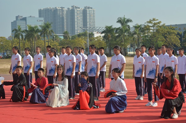 2019年11月13日上午,開發區一中第十六屆校運會開幕。入場式成為最奪目的年度校園文化盛宴,也是展示班級文化的快樂嘉年華。學生評委團交叉給各班入場式表演打分,充分展示了學校一以貫之的自主教育辦學模式。初一年級的入場式主題是“中國名著”,初二年級的入場式主題是“外國名著”,初三年級的入場式主題是“理想”。各班圍繞主題,編排了形式多樣的三分鐘表演節目。