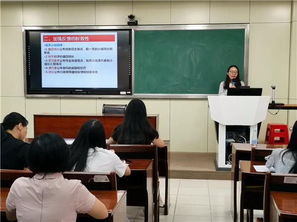 在19位新班主任自我介紹后,培訓會正式開始。首先進行經驗分享的是陳萍老師,她以“班級建設之道——精細化管理”為主題,向與會的老師們展示了自己的高效班級管理方法。陳萍老師以“分解、細化、落實”為管理班級的具體思路,把班級的管理劃分為學習、紀律、衛生、常規四部分,通過班級內成立的學習部、紀檢部、統計部、宣傳部、文體部、衛生部、人事部進行學生自治。陳萍老師在三年的不懈努力和積極探尋下,不斷培訓學生的自主學習、自主管理、自主評價能力,在初三學年成為了一名輕松、高效的班主任,所帶班級各項成績名列前茅。