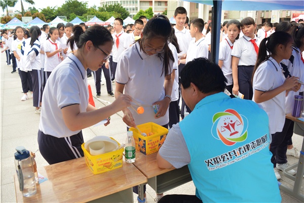 學生代表至獎品攤位領取各班的集章卡后,便進入期待已久的游園活動環節。凡是集滿8、10、12或15個章的同學即可兌換獎品。同學們興致勃勃,每個攤位前都排起長龍,大家在趣味活動中既學到了禁毒知識,又增強了拒毒意識。同學們對這種禁毒普法游園活動贊不絕口。