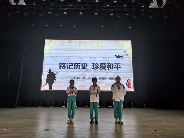 在氣勢軒昂的宣誓后,初一8班三位小演講者開始“勿忘國恥,振興中華”的演講。又是一年“九一八”,時間過去了整整88年,侵華日軍所犯下的罪行無法被時間抹去,中華民族的心靈創傷永不能安撫!華夏兒女必須要清楚牢記:銘記歷史,勿忘國殤。1931年9月18日,日本帝國主義發動了蓄謀已久的侵華戰爭,東北三省淪為日本帝國主義的殖民地,約三千萬中華兒女慘遭涂炭,陷于水深火熱之中。 中華民族經歷過太多挫折才走到今天這一步,而我們——祖國未來的希望與棟梁,是要以自己的努力換取華夏民族在世界上的發言權!“讓中國站起來,立穩足跟。”這是我們努力的源頭與方向,重任擔在我們肩頭,唯有不斷超越自己努力學習,將華夏兒女積極向上,朝氣蓬勃的精神完全散發出來,才能早日實現中華民族偉大復興。