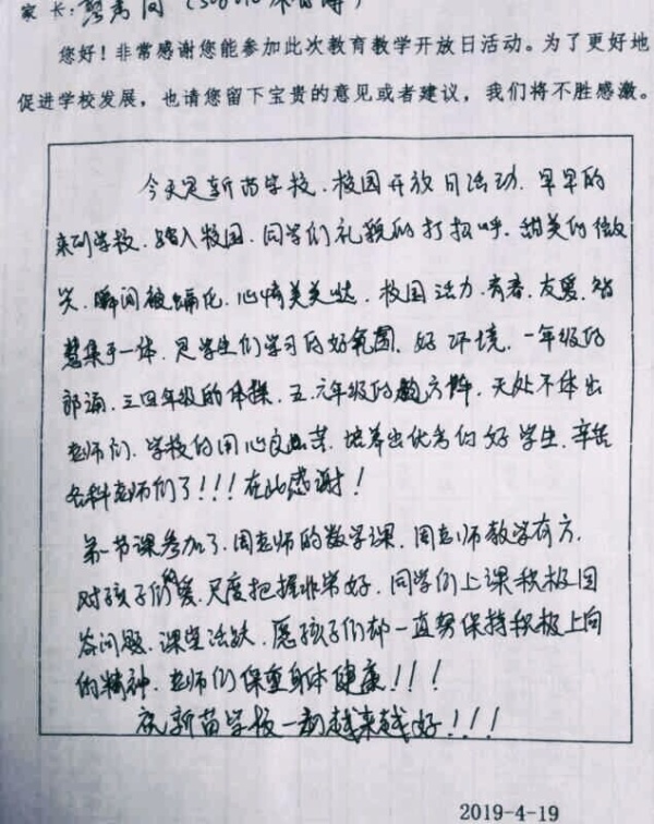活動結束后,家長們將學校印發的一張張調查問卷交到老師們的手中,家長們在充分認可學校教學宗旨與教學成果的同時,也從學校管理、教師配備、教師素質、教學管理和安全衛生等方面提出了中懇的建議。