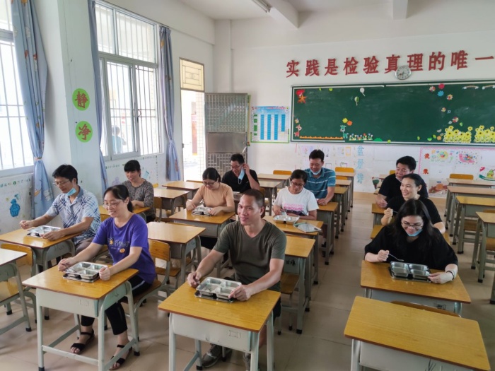模擬學(xué)生就餐時(shí),班主任教師要求將學(xué)生按規(guī)定路線,保持1米以上間隔,安靜有序去領(lǐng)餐,確保學(xué)生在安全距離下就餐,不交談。用餐結(jié)束后,要擦嘴洗手,佩戴好口罩后有序送還餐具。
