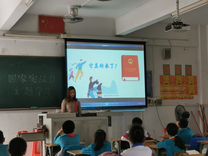 首先,通過晨會、主題班會、紅領巾廣播站、小視頻等多種形式在校園內營造了濃厚的法制教育和學習憲法、民法典相關知識的氛圍;并以班級為單位召開了“國家憲法日”主題班會。主題班會上,同學通過觀看視頻,了解什么是憲法、憲法的產生、作用等知識,老師結合身邊的例子,讓學生從實際生活中感受憲法的作用。