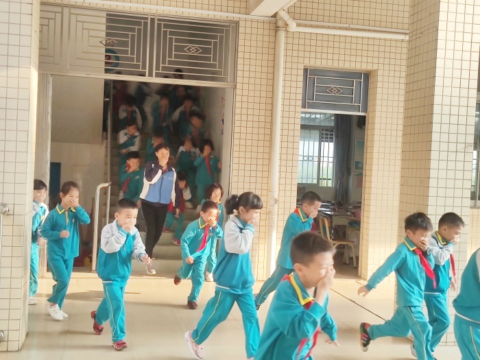8點整,隨著警報聲響起,各班班主任和科任教師及時準確地組織學生,迅速進入緊急疏散狀態。在老師的帶領下,全體學生彎著腰、貓著步,用手帕、毛巾等捂住口鼻,快速而有序地按預定疏散路線,從“災害現場”逃離,疏散到學校的操場上。1400多名師生訓練有素地從各個室場撤離到學校小操場空地,隨后各班班主任清點人數,匯報給學校安全主任。能如此快速有序地撤離,得益于浪網小學平時對安全工作的重視,師生們在疏散時牢記注意事項與撤離路線。