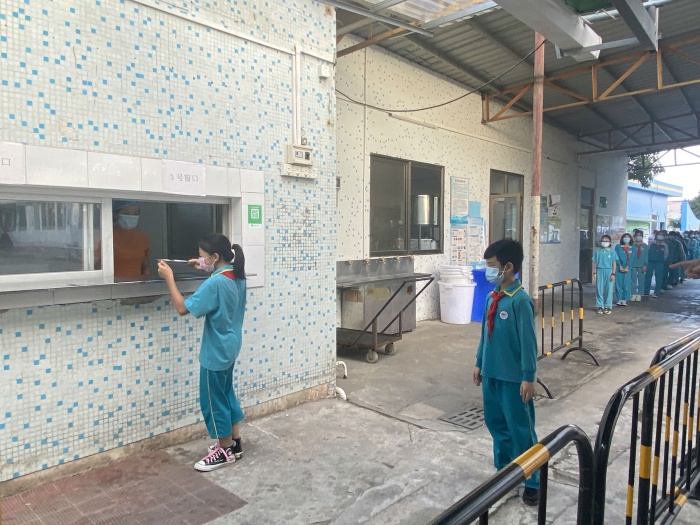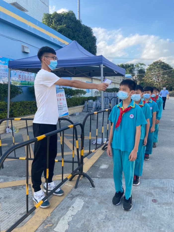 下午3:30點,演練正式開始,陸銳勛校長為本次演練的總指揮;本次分為4個主要的演練內(nèi)容,第一:早上乘校車演練;乘車學生戴好口罩,學生之間前后保持1米距離排隊候車,校車跟車員按順序為學生測溫,體溫正常(低于37.3度)才允許乘車。第二:師生進校演練;師生佩戴好口罩,有序地排隊,然后依次測溫進校。如發(fā)現(xiàn)學生體溫異常,應急處置老師聯(lián)系衛(wèi)生應急處置員,衛(wèi)生應急處置員將體溫異常的學生帶到隔離室復測體溫,體溫是異常的應致電班主任,并按衛(wèi)生應急處置員按流程規(guī)范處置。第三:食堂就餐演練;上午放學后,當班老師組織本班學生排好隊戴好口罩向食堂出發(fā),原則上按低年級到高年級順序安排領餐餐,學生進入飯?zhí)煤螅辞昂笙喔?米排隊領餐,取餐后回到各自的教室座位就餐。第四:午休測溫和上課出現(xiàn)異常應急演練;如有學生舉手報告身體不舒服,上課老師安排好其他學生自學任務后,給報告者測體溫,體溫異常的致電班主任,班主任相隔1米,帶學生到留觀室。班主任通知衛(wèi)生管理員到留觀室處置,衛(wèi)生管理員按流程規(guī)范進行處置。