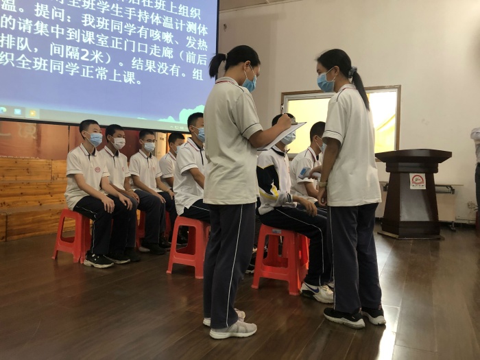 此次應急演練活動包含校門口師生員工入校檢測體溫演練、學生宿舍疑似疫情演練、課室晨午檢演練和學生嘔吐情況應急演練四個細化流程。