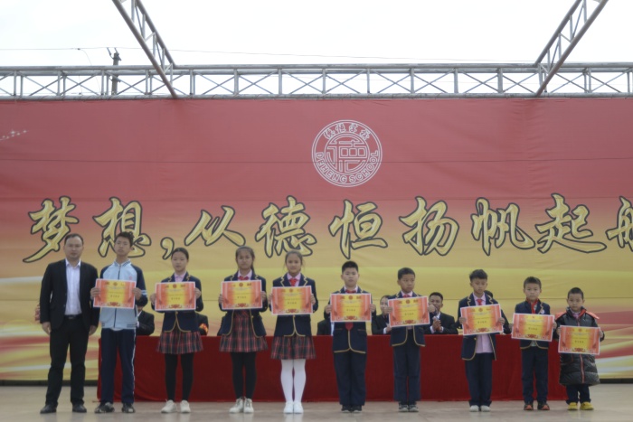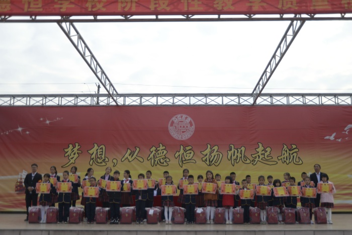 主持人宣讀在本次考試中成績名列前茅的的優(yōu)秀學子。在莊重而歡快的音樂聲中,一個個受表彰的德恒學子意氣風發(fā)地上臺接受表彰。高主任為各年級的“單科第一名”學子頒發(fā)了學科狀元獎、楊主任為這次月考中突飛猛進的學子頒發(fā)了“進步之星”獎。華主任為各年級成績優(yōu)異的學子頒發(fā)了“學習標兵”獎。最后,王校長為各班級的學霸們頒發(fā)了“學習之星”的獎狀并獎勵一個個精美書包,以此激勵學生們戒驕戒躁、再創(chuàng)輝煌。領(lǐng)獎同學如沐春風,笑容滿面,向頒獎的領(lǐng)導(dǎo)、臺下耕耘的老師以及為他們鼓掌加油的同學鞠躬致敬!