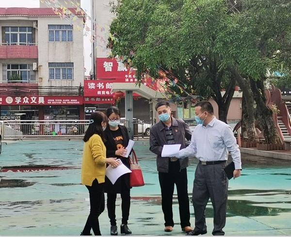 3月18日下午, 中山市教育和體育局郭勇、管淑花科長來到民眾鎮民眾中心小學,對疫情防控及開學準備工作進行了全面的、深入的調研督查。