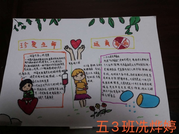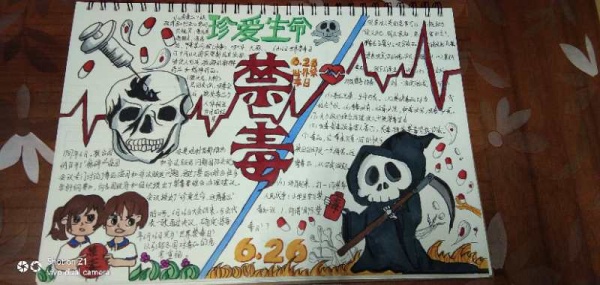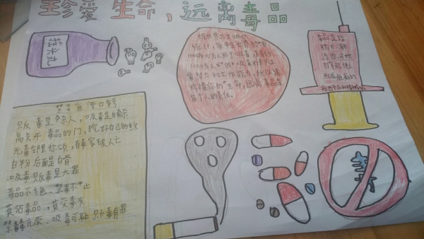 這次禁毒教育圍繞“珍惜生命,拒絕毒品”為主題展開。同學們都積極參與,通過查閱各種資料,來創作和繪畫,在上交的一幅幅手抄報中,形式多樣、內容充實、色彩鮮明,有硬筆書畫作品,有彩鉛作品,也有水彩作品等等。同學們用資料、圖片、漫畫等多種生動的形式介紹了禁毒知識和毒品危害。