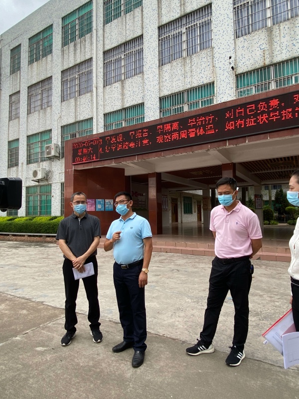 為切實做好開學(xué)疫情防控工作,保障全體師生的身體健康和生命安全,2020年5月9日上午,民眾鎮(zhèn)鎮(zhèn)長黃聲群、黨委委員劉釗妍與譚偉強、衛(wèi)健局羅財有、市場監(jiān)管局崔澤華、疾控中心黃良輝、鎮(zhèn)教育事務(wù)指導(dǎo)中心梁冬梅副主任、鐘偉云、胡穎臻老師等一行人來到新平小學(xué),對2020年春季四至六年級開學(xué)返校準(zhǔn)備工作及疫情防控工作,進行督導(dǎo)檢查;陸銳勛校長、湯斌英副校長、覃小梅衛(wèi)生副校長以及學(xué)校新冠肺炎防控復(fù)學(xué)工作領(lǐng)導(dǎo)小組成員全程陪同。此次檢查,通過聽取匯報、現(xiàn)場檢查、查閱資料的形式進行核驗。