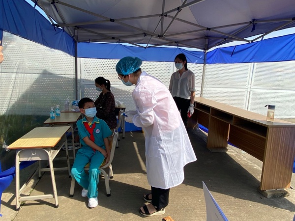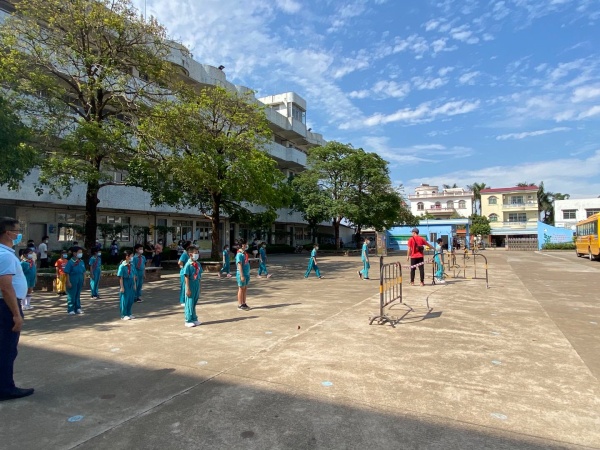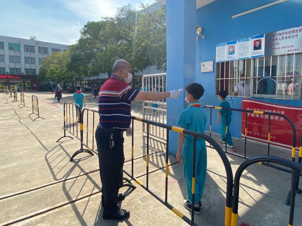 下午3點,演練正式開始,陸銳勛校長為本次演練的總指揮;本次演練分為7個演練內(nèi)容,第一:早上乘校車演練;乘車學(xué)生戴好口罩,學(xué)生之間前后保持1米距離排隊候車,校車跟車員按順序為學(xué)生測溫,體溫正常(低于37.3度)才允許乘車。第二:師生進校演練;師生佩戴好口罩,有序地排隊,然后依次測溫進校。第三:師生課間管理及體育課演練;下課后,學(xué)生一律在教室內(nèi)各自座位上休息,不能走動(上洗手間除外)。上體育課時,學(xué)生帶好口罩,體育老師到班組織學(xué)生按1米距離集隊和列隊到運動場。上課期間,學(xué)生不用戴口罩,一切活動要保持一定距離,不能出現(xiàn)聚集。第四:食堂就餐演練;上午放學(xué)后,當(dāng)班老師組織本班學(xué)生排好隊戴好口罩向食堂出發(fā),原則上按低年級到高年級順序安排領(lǐng)餐餐,學(xué)生進入飯?zhí)煤螅粗敢〔停〔秃蠡氐礁髯缘慕淌易痪筒?。第五:午間測溫演練;各班班主任手持測溫槍,對學(xué)生逐一學(xué)生測溫,跟班老師負(fù)責(zé)記錄。第六:下午乘校車演練;學(xué)生戴好口罩,保持距離從各班到飯?zhí)们懊姘锤魅酥付ň幪栒军c集隊,集隊時不允許交談。集隊完畢后,由校車管理員、校車值日老師和值班行政帶學(xué)生到校車停泊點上車,學(xué)生在行走過程要保持1米距離。第七:放學(xué)演練;采取分年級錯時放學(xué),全校先在班級進行衛(wèi)生安全教育,然后由當(dāng)班老師組織本班學(xué)生戴好口罩,在教室外按照安全距離排好隊伍,帶領(lǐng)學(xué)生到指定的區(qū)域等候(途中教育學(xué)生保持距離,不能牽手)。最后是消毒演練;每節(jié)課學(xué)生上課后及放學(xué)后,保潔員用噴壺或噴霧器開展對學(xué)校的樓道、走廊、護欄、洗手間進行消毒。