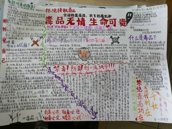 本次活動(dòng)的開展,一方面展示了學(xué)生的風(fēng)采,鍛煉了學(xué)生合作、創(chuàng)意、書寫、繪畫、查找收集資料等多種能力,同時(shí)也讓同學(xué)們深刻認(rèn)識(shí)到毒品的危害,紛紛表示一定要遠(yuǎn)離毒品,并且積極參與抵制毒品的斗爭(zhēng),為創(chuàng)建和諧的社會(huì)而貢獻(xiàn)力量。