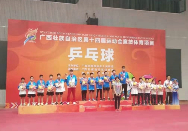 相約千姿百色,點燃區運激情。11月18日晚,廣西壯族自治區第十四屆運動會在百色市隆重開幕。錦標學校廣西籍乒乓球運動員林像曜同學代表百色市參加青少年組乒乓球項目比賽榮獲團體冠軍。
