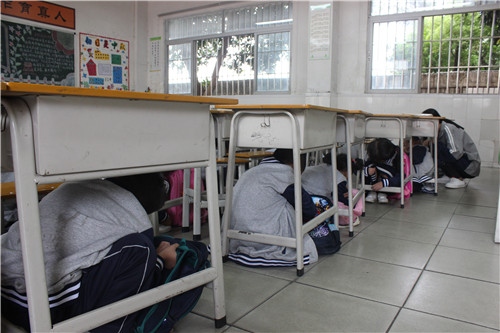 演練前學校政教處制定了詳細的演練方案,并由各班班主任給學生講述應急避震的保護措施和震后自救知識,特別強調了在家中、在學校如何防震避震的知識。其后政教處陳七靈干事再次強調了演練的相關要求,告訴學生在疏散時不要慌張,不要推擠,要嚴肅,要當作是真的地震發(fā)生,而不是游戲,要在教師的引導和統(tǒng)一指揮下有序疏散。